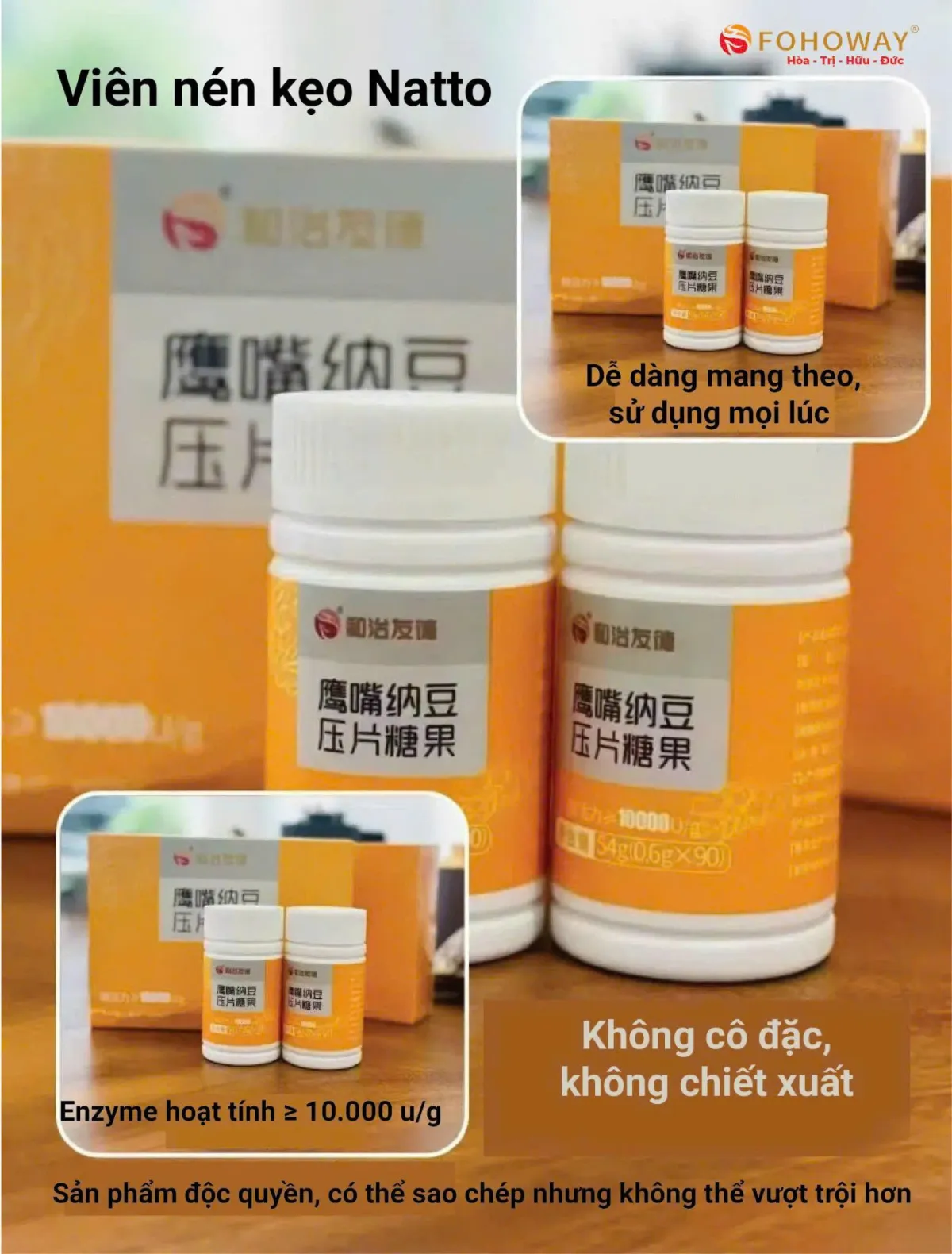 🔹 Viên kẹo Natto Fohoway là sản phẩm bổ trợ sức khỏe tim mạch, giàu enzyme Natto Kinase – hoạt chất có khả năng làm tan cục máu đông mạnh mẽ.